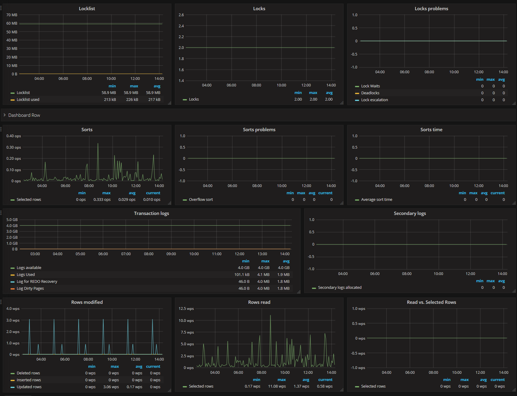 Zobrazení dashboardu s grafy, které ukazují klíčové parametry relační databáze DB2 v čase.